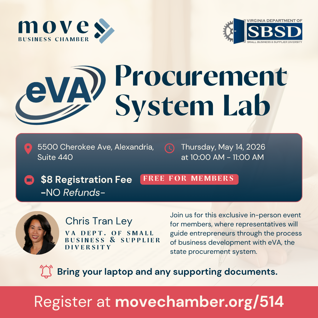 Join us for this exclusive in-person event for members, where representatives will guide entrepreneurs through the process of business development with eVA, the state procurement system.