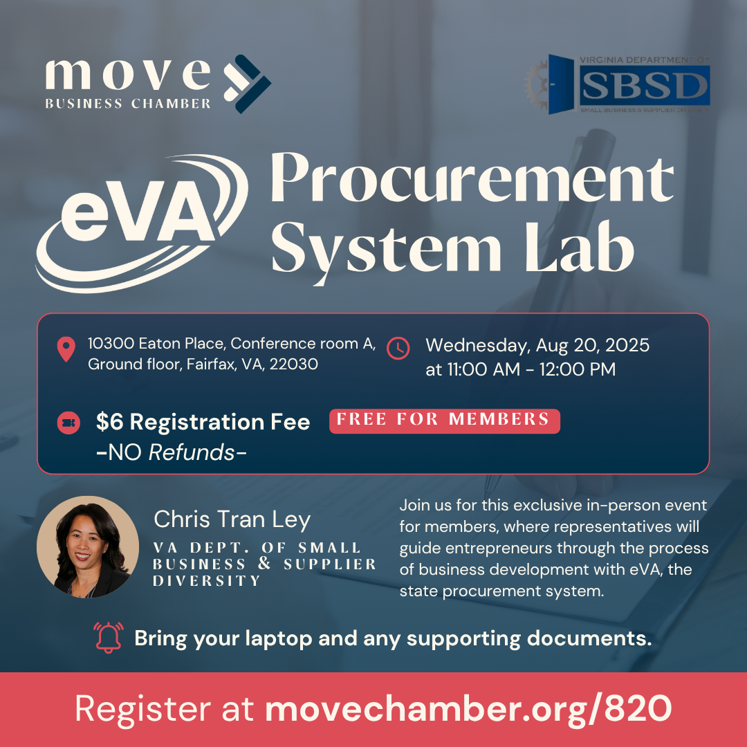 Join us for this exclusive in-person event for members, where representatives will guide entrepreneurs through the process of business development with eVA, the state procurement system.